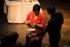 Le musicien, quant à lui, improvise au même rythme que les comédiens, utilisant bruitages et compositions musicales pour enrichir les récits inventés sur scène.